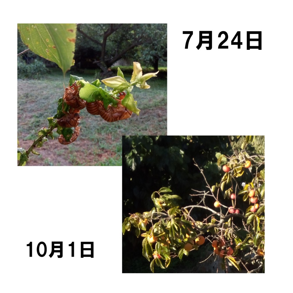 柿の写真を2枚アップしようと思いましたが、なんかつまんないな、と思ってさらにスマホのギャラリーを見ていたら「これいいかも」と思い並べてみました。7月の暑い盛りともうすっかり秋の比較です。 -