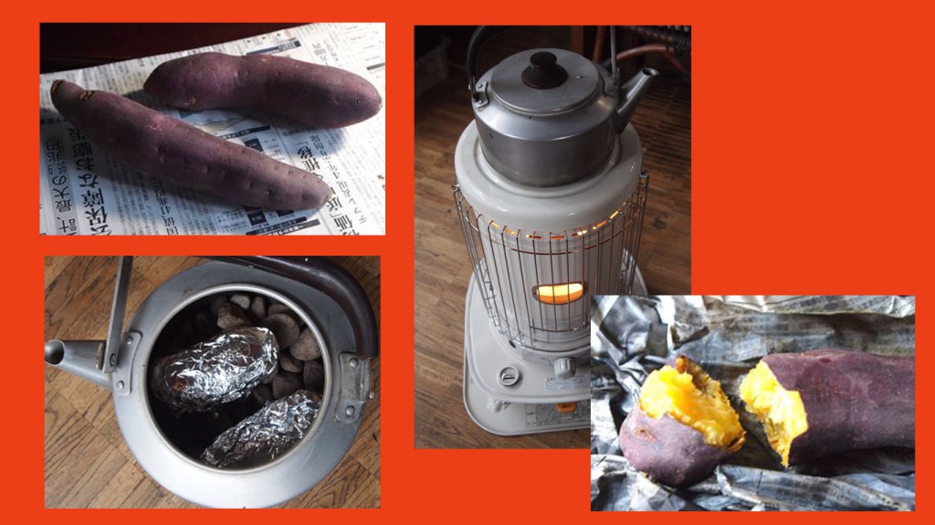 受講生の方に教わったストーブで石焼き芋を焼く方法です。1.河原で拾った小石を使わなくなったヤカンに敷きます。2.芋を濡れた新聞紙で包みさらにアルミホイルで包みます。3.石の上に置き1時間くらいストーブを炊くと出来上がり。1時間半受講の方と... -